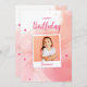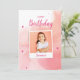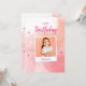This design is a festive birthday greeting card featuring a joyful image of a young girl smiling. The background has a pink watercolor texture with gold speckles and floating stars, adding a whimsical and celebratory touch. The words "Happy Birthday" are prominently displayed in a playful, cursive font, making it an ideal card for extending warm birthday wishes.
