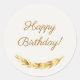 A soft ivory colored background. Text: Happy Birthday! Decorated with faux gold leaves.