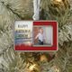 A picture of the sunset over the ocean with the words "Happy Birthday Jesus" and red Christmas trees on the bottom of the design. This ornament is personalised so all you have to do is switch our photo to your photo.