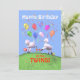 Birthday card for twins with my artwork of two cute little twin lambs celebrating their birthday with birthday balloons. Customisable text says "Happy Birthday to the Twins!"