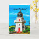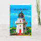 A painted "Happy Birthday" card depicting a Lighthouse with puffy clouds in the background. A tranquil and serene theme. An idyllic, positive and energising card.