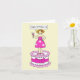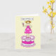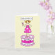 A cartoon lady standing on top of a cake holding a cocktail. The lady is saying 'Happy Birthday Liz'. The image has a lemon colored background.
