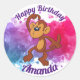 This sticker can be customised and is super cute! It has a cartoon monkey in the centre and a pink, purple, and blue background.
