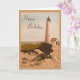 This lighthouse greeting card features Great Point Lighthouse on Nantucket, MA, with a subtle blue sky and sand dunes below. Original artwork by William Nihill. Card reads: