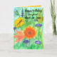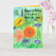 Happy birthday greetings to a special niece-in-law decorated with a colourful summer garden of orange, yellow, pink, and purple flowers hand painted with watercolor with a warm summer green and turquoise blue background. On the inside is a coordinating shade of bright yellow with text you can edit to fit your needs.