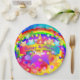 Bright and beautiful, psychedelic Happy Birthday paper plates, to match our birthday place setting (HAMbyWhiteGlove). Every colour of the rainbow seems represented here with red, green purple, blue, orange, aqua, yellow and more! 203-302-0337