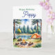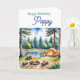 A personalized grandpa's birthday card with a watercolor illustration of a campsite with pine trees, a lake and a tent. Happy birthday Pappy.