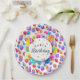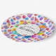 A Colorful Happy Birthday Paper Plate Design With Hats, Balloons and Gifts