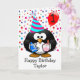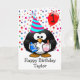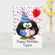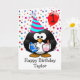 This cute, funny, unique design has a cartoon penguin holding a birthday gift and birthday cake, wearing a cute birthday hat, holding a red balloon with the number 1 with a colourful polka dot background on the front with the words, "Happy Birthday Taylor" and the words, "I hope that when today is all done, you can say that your birthday was fun!" on the inside. You can customise this item by changing the front text, age and name to whatever you like and also the words on the inside. What a cute personalised birthday card. Created by Karen Hall based on edited public domain artwork. If you need additional help with customising this product or any other product in this store, please email me at ybnormalone@gmail.com. Please see our matching gift bags, wrapping paper, tissue paper, postage stamps, and gifts. Thanks for stopping by.