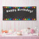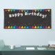 Happy Birthday banner for photo backdrop or virtual birthday party celebration. Brightly coloured triangle pennants at top and bottom along with confetti and stars scattered around the text on a black background make a festive statement.