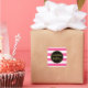 Happy birthday party favour tag stickers with in hot pink black gold and white stripes pattern.