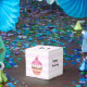 Pink striped cherry cupcake box, striped pink background. Happy Birthday .