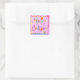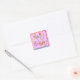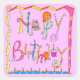 Happy Birthday sticker features hand drawn whimsy art using balloons, a cupcake and birthday cake to help form the letters. The Happy Birthday words are surrounded by a whimsy border and is on a pink background.