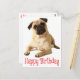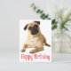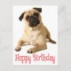 This fun canine postcard features an image of a beautiful chubby Pug puppy with a birthday greeting printed in a swirly red font highlighted against a crisp white background. The back of the postcard is blank for your message.