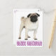This fun canine postcard features an image of a beautiful creamy and black Pug puppy dog with a birthday greeting printed in a fun purple font highlighted against a creamy pink background. The back of the postcard is blank for your message.