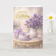 A graceful, cottage-inspired birthday illustration showcasing a lush bouquet of purple irises arranged in an ornate vintage pitcher. A delicately frosted lavender cake with glowing candles, pastel gift boxes, and soft lace textures create an atmosphere of elegance, calm, and heartfelt celebration.