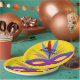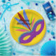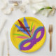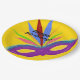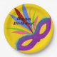 Happy Birthday disposable party plates. Pretty Purple Mask with colourful pink, green, yellow gold, blue and red feathers with the look of glitter on a golden yellow background. Leave Happy Birthday text as is, edit or delete. Perfect for Birthday Parties, Sweet 16, Masquerade Ball, Mardi Gras festivities. Personalise for your special occasion. Original Graphic Artwork by TamiraZDesigns.