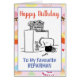 Washing machine repairs. Washing machine repairman is working on fixing a washing machine. Personalise with your own details and message. Cupcake background. Funny Birthday Card for a repair man.