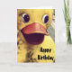 Cute and funny photo of a big yellow rubber ducky sitting on a wooden porch. This duck, has a big red beak and wide staring eyes. Covered in dirt, perhaps waiting for the rain shower to wash away the dirt. Has a cute look on his face.