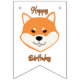 This bunting banner display the words "Happy Birthday" in a unique print font with orange letters black outline with a Shiba Inu dog face in the centre in this birthday theme and style. All banners have single sided printing outdoor safe made with sturdy plastic polystyrene and thick plastic rope has (16) 5.5" x 8" swallowtail flags on a 6' long string.