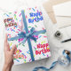 Colourful Happy Birthday text on white background with colourful candy sprinkles