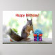 Photo of a cute squirrel standing next to two small wrapped presents and looking straight at the camera. "Happy Birthday!" is the caption, in red type.