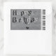 The words HAPPY BIRTHDAY in plastic black and white lettering. Love hearts and music notes are around the lettering. The background is grey with a sheet of music softly fading behind it. Piano keys run down the right side of the image.