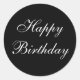 Round sticker shown in black/white with a Happy Birthday wish. Customise this item or buy as is.