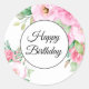Round happy birthday sticker is shown with a pretty pink floral print.