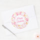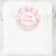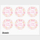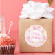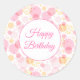 Large round happy birthday sticker is shown with a festive pink circles print.