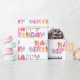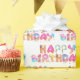 Happy Birthday text with sweet desserts and colourful sprinkles on white