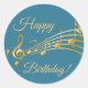 Happy Birthday teal blue green gold music notes Classic Round Sticker