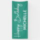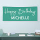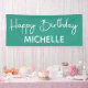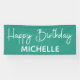 Basic, simple teal and white "Happy birthday" party banner customised with the name of the guest of honour in a whimsical script font.