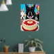 a birthday cake with candles and three dog with a birthday hat on. This is a AI generated art.