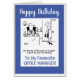 Office Manager birthday card. Personal Assistant is leaving early because she didn't arrive quite so late. Personalise with your own details and message. Ideal funny birthday card for an Office Manager. Dark blue background.