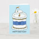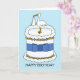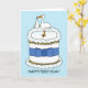 A cartoon cake with a stork standing on top. The stork is holding a baby in a sheet which hangs from it's beak. The image has a pale blue colored background and is accompanied by the words 'Happy Birthday'.