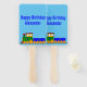 A train is going down the tracks above your personalised message (shown: Happy Birthday Alexander). Change the train's number to the child's age (shown: 1). The hand fanis sky blue.