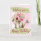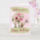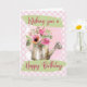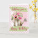 Happy Birthday - Watercolor Watering Can. A pretty card for the gardeners in your life. A watercolor watering can containing flowers and foliage is the main image with "Wishing you a " in pinky-red writing at the top of the page, and "Happy Birthday" beneath the image. Both writing elements highlighted in a sage-green colour. The background is a soft pink gingham. Inside the card is a simple message - with love.