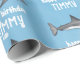 This design features a happy birthday kids' child fun, a blue whimsical ocean shark animal, with wildlife wildlife marine fish, a sea Sealife water beach tropical, a cool unique watercolor blue water, a trendy stylish creative typography, a children's birthday party gift wrap, for kid's children's party supplies, shark fish wrapping paper style, a cute whimsical funny wrapping supplies