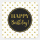 Happy birthday party favour tag stickers with in white black and gold polka dots pattern.