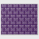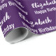 The birthday wrapping is dark purple. It has a text pattern for the recipient's name in a script and the phrase Happy Birthday. The name (Shown: Elizabeth) appears in an elegant script. The text is white. All of the text can be edited.