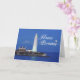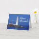 Beautiful blue card is very striking with the lighthouse on the ocean.