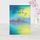 Happy Birthday written in a fancy dark blue font. A pastel coloured scenic landscape with mountains and and a spruce trees in the background and a turquoise lake glowing yellow with the suns reflection. A few birds can be seen flying off in the distance. The message inside reads: Happy Borthday. Best wisjes for a wonderful day. May the coming year be filled with laughter, joy and happiness. The message can be personalised / customised.