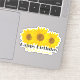 Three yellow sunflowers with text "Happy Birthday!" in retro font and custom name in script.