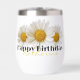Three white daisies with text "Happy Birthday" and a template for custom name in yellow.