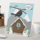 The snow just stopped and a cute blackbird is singing happily perched on the roof of his snowy house. The birdhouse is hanging from a branch. The landscape depicts a winter scene with snow, pine trees and mountains. This cartoon illustration is an ideal gift for people who love birds, winter and music.