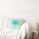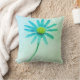 Happy Stylised Blue Turquoise Green Daisy Flower Cushion / Throw Pillow to add to your home / office / business decor collection. A cool gift / present for all who love nature, planet, organic theme, positive vibes, bright colours, minimalism, plants, trees, planet etc. Structure, texture, light, sell. Yellow Green, turquoise, purple. Each side is slightly different. Grey background.