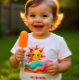 Personalized cheerful and vibrant summer baby t-shirt. It features a friendly smiling sun peeking over a series of colorful, flowing rainbow waves in a hand-drawn style. This charming piece makes a perfect gift for a boho-themed baby shower or a first birthday celebration.
