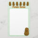 Cute brown cartoon potato with an adorable happy face stands in the bottom right corner and across the top of the paper is a line of the same funny potatoes. The background is a classic pattern of green and white checks, gingham. A template reading Potato Notes in orange lettering below the row of potatoes at the top of the page is a template that can be used as is or changed to your own name or text.