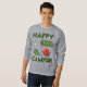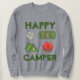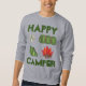 Sweatshirt features an original marker illustration of a tent, campfire, compass, and sleeping bag roll, with HAPPY CAMPER in a fun green font. Great for your favourite camping enthusiast!